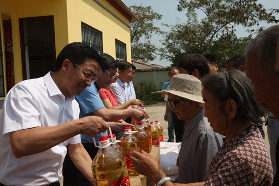 圖片說明:2016年9月10日河南省人民醫院院長顧建欽(左一)、黨委書記邵鳳民(左二)帶領醫院領導班子成員到高白玉村調研指導駐村扶貧工作的同時,慰問村內特殊群體