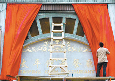 2005年3月,廣州太平館西餐廳門外,一名裝修工人在安裝復業儀式上揭幕用的紅布。