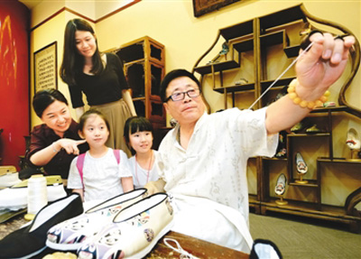 在日前舉行的第五屆京交會上,內聯升第五代傳承人蔡文科現場演示制作手工布鞋,吸引了眾多游客。細細麻繩手中過,一雙“一”字底布鞋每平方寸需要不多不少地納上81針,整雙鞋至少2100針。