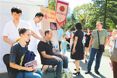 2017年9月16日,塞爾維亞首都貝爾格萊德市民在體驗同仁堂醫師的按摩。