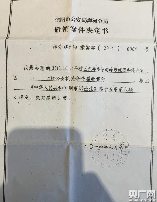 但報案人吳作新沒有想到,2014年7月,信陽市公安局洋河分局發出了《撤銷案件決定書》。