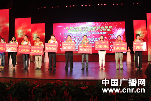 8月22日下午,“許昌市貧困助學十年總結表彰暨2011年助學助業資金發放儀式在許昌市許都大劇院舉行。市總工會向100名貧困學生代表發放了41.7萬元助學金,向9名貧困學生家長共發放了27萬元救助金。中共許昌市委書記李亞、許昌市人民政府市長張國暉、河南省總工會副主席王永領等領導出席了本次活動。