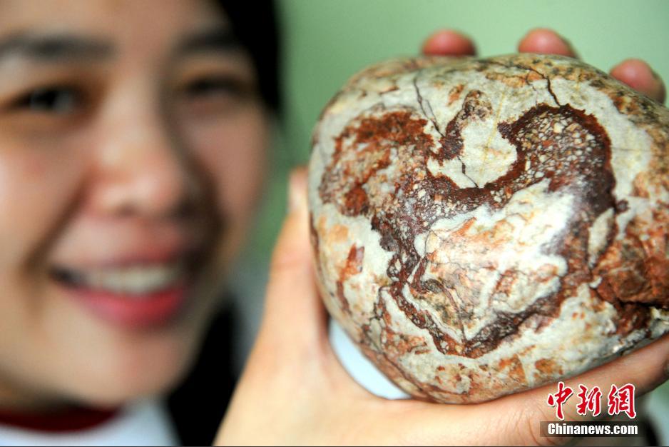 央廣網河南分網消息 據中國新聞網報道:1月9日,福建省福州市一奇石收藏者展示“中國地圖”奇石。這枚鵝卵石上天然形成了一個寬8厘米、高6.6厘米的紅褐色圖案,外形酷似一幅中國大陸版圖。這枚鵝卵石是20多年前在甘肅省和政縣廣通河河畔發現的,重1.39公斤,質地堅硬、色澤艷麗、紋理清晰、橢圓秀美。(張晴 攝)