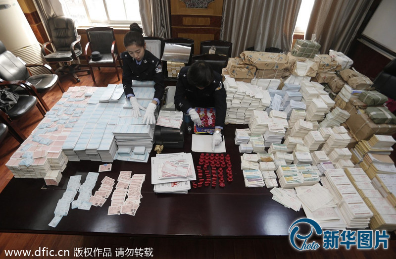 央廣網河南分網消息 據中國新聞網報道:2014年1月13日,武漢鐵路警方對外宣布,歷時2個月成功偵破全國最大系列制販假火車票案,連續搗毀3個制販假火車票窩點,收繳高仿真假火車票百萬余張(已制成全國各地假火車票282張);大量假國稅、地稅發票;裝有假火車票待發物流快件12件、已發快遞單74張;以及偽造公章56枚,打印機、電腦、裁紙機、打孔機、壓票機等一批作案工具。抓獲犯罪嫌疑人8人,起獲一大批制販假各種票據等工具。