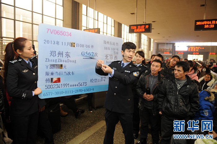 1月15日,鄭州鐵路公安處民警在鄭州火車站候車大廳指導旅客辨別火車票真偽。