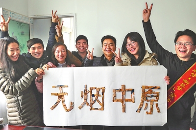 葉欖(右一)和志愿者用煙頭拼圖倡導(dǎo)“無(wú)煙中原”。