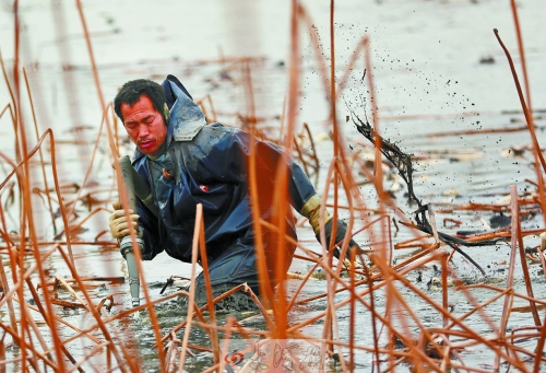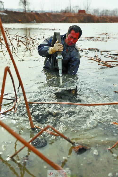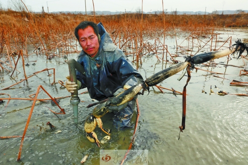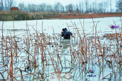 如今,楊宏凡采用最新技術高壓水槍挖藕,需要跳進水里用水槍沖去覆在蓮藕上的淤泥。“這兩天還不算冷,水面沒有結冰,省事多了。”換上橡膠衣的楊宏凡一邊下水,一邊告訴記者,前兩天挖藕時,必須要有個人給他敲冰才行。