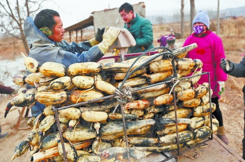 央廣網河南分網消息 據大河報報道:時下已是“四九”天,俗話說“三九四九冰上走”,寒風吹得人們都不想出門。但孟津會盟鎮黃河灘上,卻有一群人正頂著嚴寒在冰冷刺骨的池塘里忙活:在黑泥地里彎腰翻土,將雪白脆嫩的蓮藕從黑淤泥中挖出。他們就是黃河灘上挖藕人。