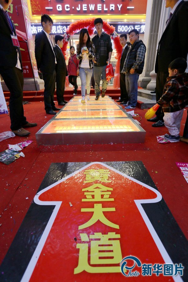 2014年3月30日,鄭州市民從用500公斤黃金鋪成的“黃金大道”上走過。