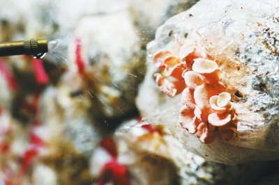 隨后,記者在王冬冬的帶領下進入了食用菌大棚,只見里面密密麻麻地擺滿了菌袋,幾名大學生正在往棚里噴水以增加濕度。采訪中,菌袋上粉色的平菇吸引住了記者。“這是我們自己培育的新品種,具有觀賞性和食用性,而且比一般平菇口感更好,目前市場上還沒有此品種。”王冬冬告訴記者。