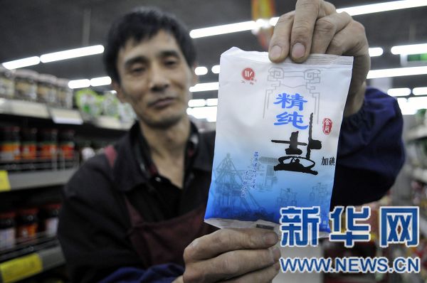 4月21日,在河南鄭州市黃河路上一處超市內,工作人員展示出售的食鹽。