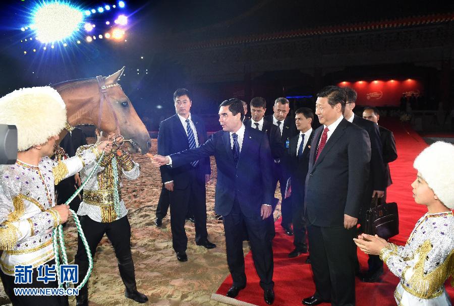 習近平接受了別爾德穆哈梅多夫代表土方贈予中方的一匹汗血馬。掌聲、金鈴聲、歡呼聲響徹夜空。