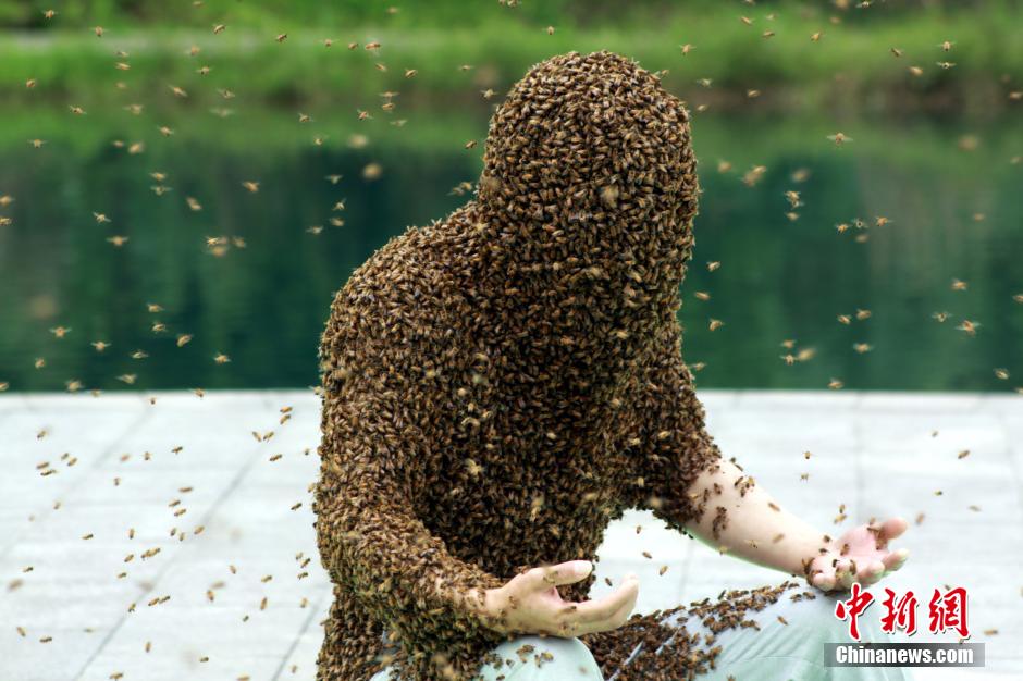 央廣網河南分網消息 據中新網報道:5月13日,“吉尼斯中國之夜”在江西宜春明月山明月廣場舉行。江西“第一蜂人”、宜春市奉新縣養蜂人阮良明挑戰“人體肩部以上布滿蜜蜂堅持時間最長”吉尼斯世界紀錄。最終,吉尼斯認證官宣布,阮良明的人體肩部以上布滿蜜蜂堅持時間為53分34秒,成功創造了吉尼斯世界紀錄。(鄒海斌 攝)