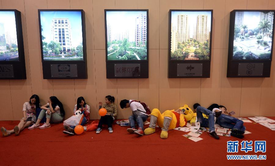 5月18日,杭州人居展上,推銷樓盤的工作人員在房交會現場的樓盤燈箱廣告下休息。