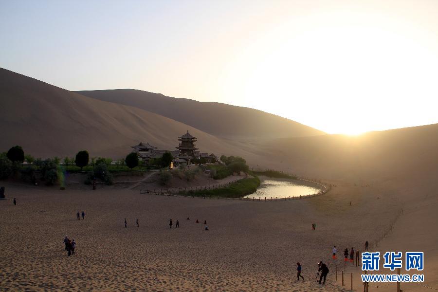 央廣網河南分網消息 據新華網報道:初夏時節,甘肅省敦煌市鳴沙山月牙泉景區風光秀美,吸引眾多中外游客前來觀光游覽。 新華社發(張曉亮 攝)