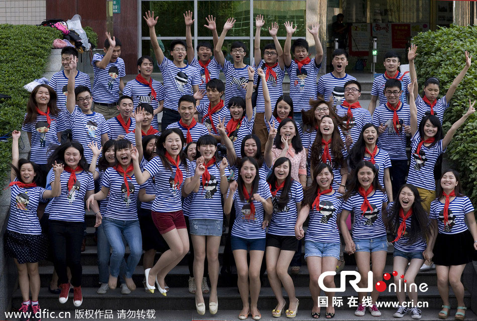 2014年5月16日,湖南省郴州市湘南學院的經濟與管理學院2010級國際經濟與貿易專業二班的畢業就是照與眾不同,他們衣著永不過時的海紋紗和紅領巾的同學們風趣地說,我們不是“一般人,我們是二班人”,四年的專業學習,他們有的考上了其他大學的研究生,有的將要走向新的工作崗位。這不,他們是時代的弄潮兒。圖片來源:劉衡/東方IC