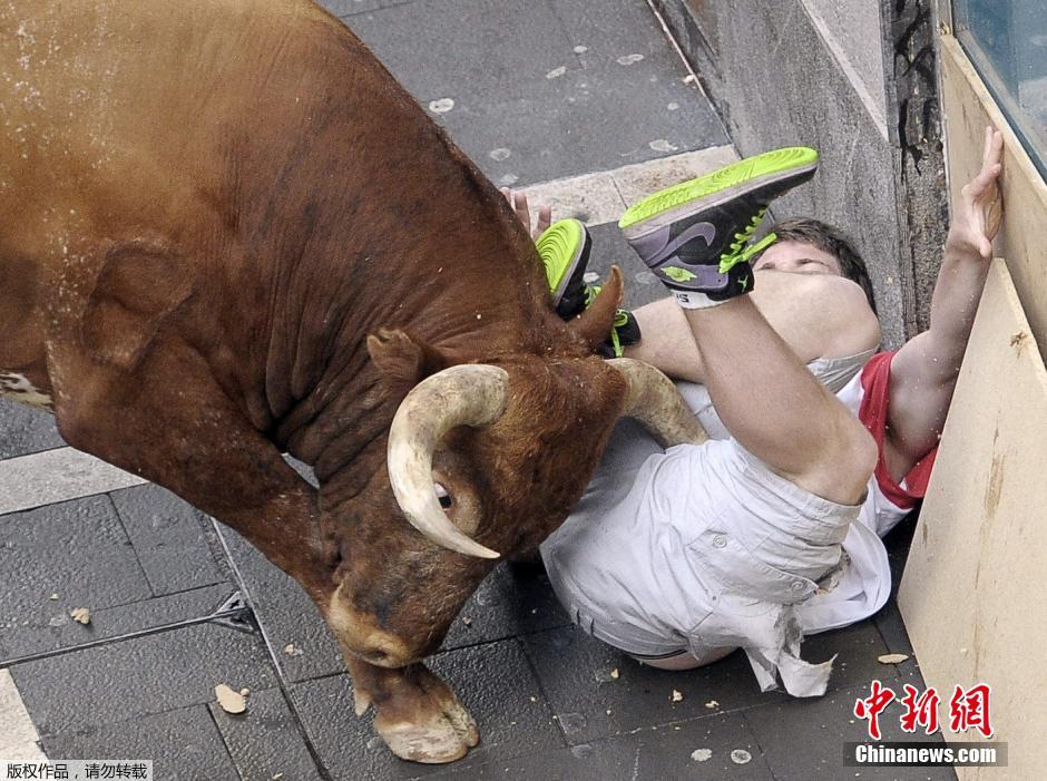當?shù)貢r間2014年7月14日,西班牙潘普洛納奔牛節(jié)持續(xù)。據(jù)外媒報道稱,截至14日共有兩名參賽選手在奔跑中被牛角頂傷。