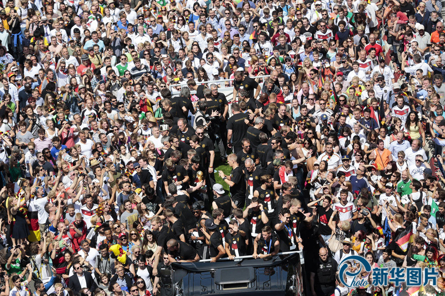 央廣網(wǎng)河南分網(wǎng)消息 據(jù)新華網(wǎng)報(bào)道:當(dāng)?shù)貢r(shí)間2014年7月15日,德國(guó)柏林,德國(guó)隊(duì)歸國(guó)舉行奪冠巡游。在當(dāng)天的奪冠慶祝活動(dòng)中,德國(guó)隊(duì)將士的敞篷大巴車將經(jīng)由柏林的鹿拉教堂街、河畔、萊因哈特街道、luisenstrasse街區(qū)、馬歇爾橋,最終抵達(dá)巴黎廣場(chǎng)。
