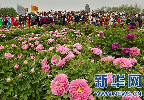 游客們在河南省洛陽市隋唐城遺址植物園的牡丹園內賞花、游玩(2014年4月13日攝)。