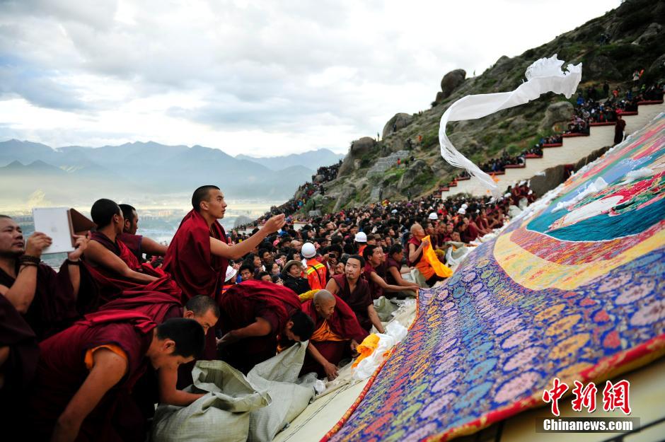 8月25日,拉薩哲蚌寺舉行展佛儀式,僧人們協(xié)力展開(kāi)巨幅釋迦牟尼佛像。中新社發(fā) 唐朝楊 攝