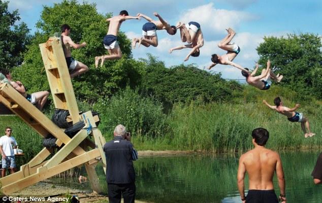 據英國《每日郵報》當地時間2014年8月30日報道,一對兄弟,26歲的Johannes Schrieber與他的哥哥28歲的Daniel,建造了一個木制機械,可以將人彈射出去12米,高度可以達到5米。兩兄弟用這“人體彈弓”將自己射進湖水中,而他們發明的初衷竟然是認為這比乘飛機要便宜。他們共募集到700英鎊的捐款,每一分錢都用在了刀口上,至今還沒有人死亡。 (網頁截圖)