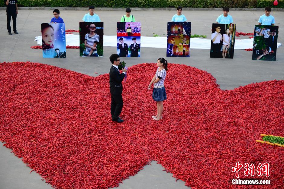 8月29日,河北省邯鄲市雞澤縣小伙兒豆子旺在一辣椒加工企業上演浪漫一幕,他用九萬九千九百九十九只紅辣椒擺成巨大“心”形,向心儀已久的女友表白求婚,讓在場的人們見證這一浪漫溫馨時刻。 中新社發 胡曉華 攝 圖片來源:CNSPHOTO