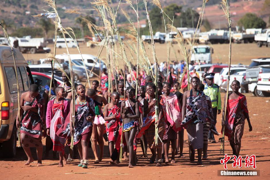 2014年8月27日至9月2日,南部非洲國家斯威士蘭舉行一年一度的“蘆葦節”選秀女活動。近10萬名未婚處女手持蘆葦,袒胸露乳,伴隨著音樂翩翩起舞,接受國王姆斯瓦蒂三世的遴選。一旦被國王選中,這些少女將獲得數十頭牛的厚重聘禮,并有望改變自己家族的命運。目前,姆斯瓦蒂三世已經納有14位妃子。張楷 攝