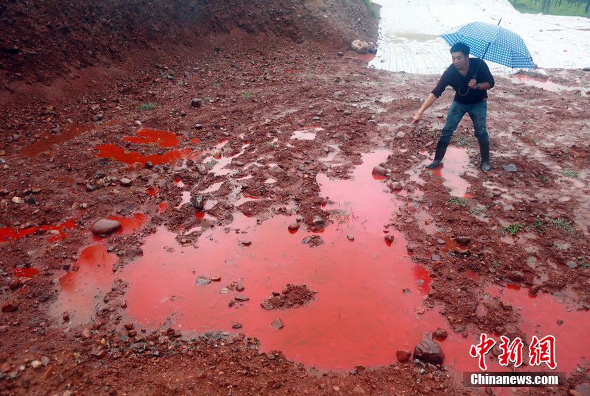 投產不久就出了問題。”該男子告訴記者,去年12月份,廠子在生產過程中發生事故,造成罐體爆炸,整罐染料都流出來了,地下水都污染了,后來環保局就把廠子關了。山頂上都是廠子以前的殘留物,這次雨下得大都溢出來了,這才導致山下的馬蘭河里出現了“紅水”。