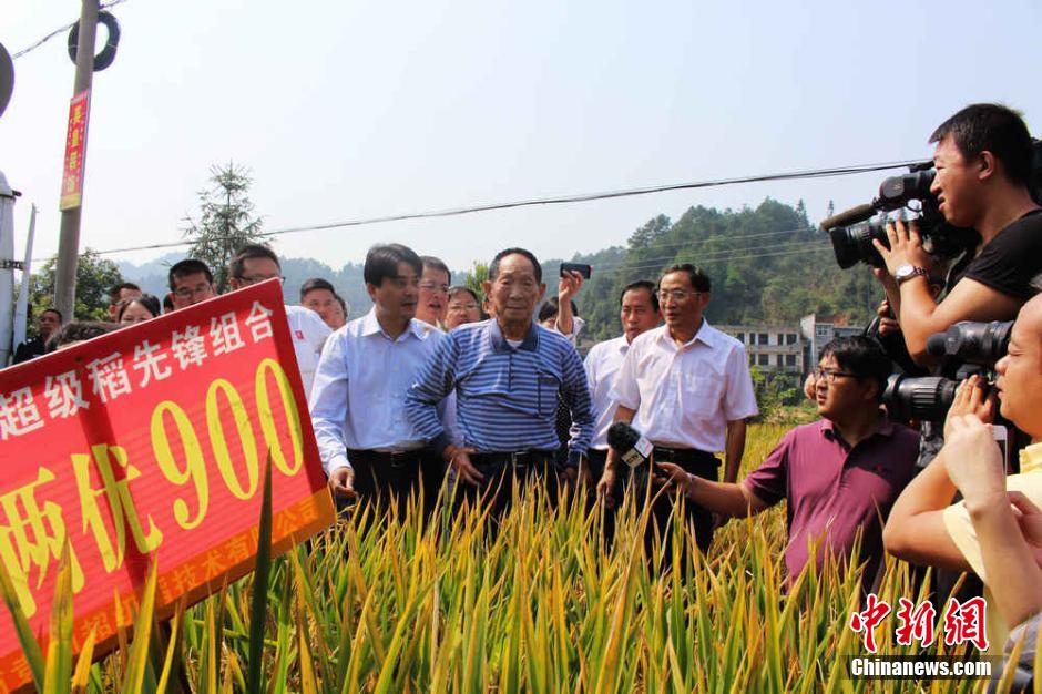 10月10日,農業部組織專家,對由袁隆平院士領銜的第四期中國超級稻畝產1000公斤攻關項目進行了測產驗收。測產結果顯示,湖南溆浦縣橫板橋鄉紅星村超級稻攻關基地,百畝片平均畝產1026.70公斤。這標志著中國超級雜交水稻第四期目標畝產1000公斤攻關獲得成功,再創世界紀錄。 當天,“雜交水稻之父”袁隆平抵達湖南溆浦縣橫板橋鄉紅星村超級稻攻關基地,視察由其領銜主攻的中國超級雜交稻第四期攻關品種“Y兩優900”生長情況。圖為袁隆平視察超級雜交稻第四期攻關品種“Y兩優900”生長情況。唐小晴 攝