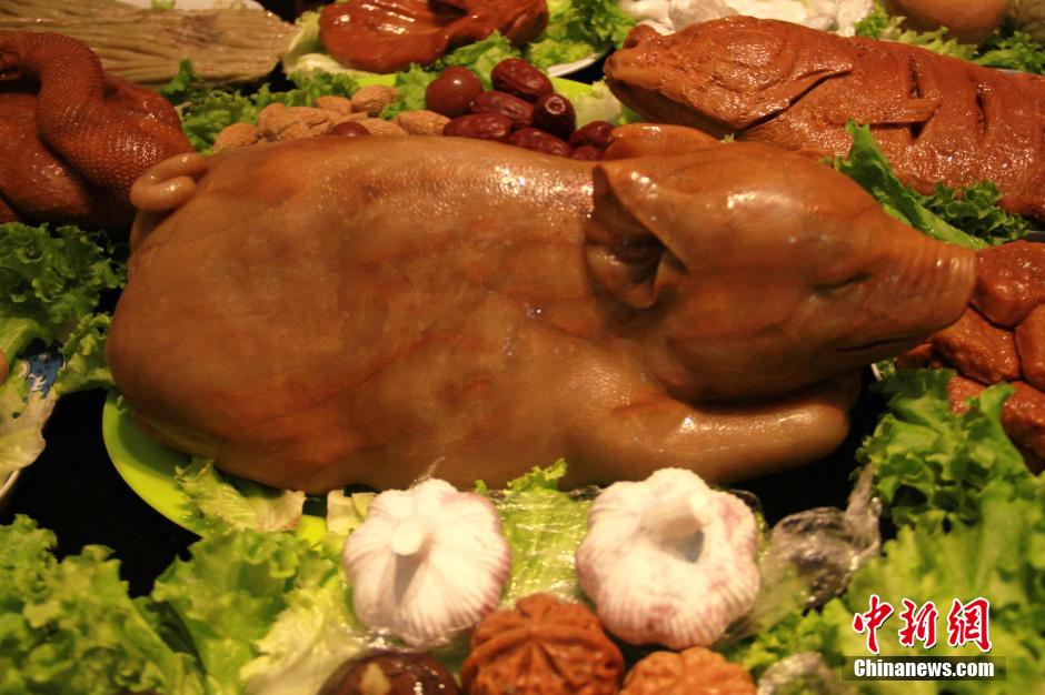 10月10日,一套造型逼真的“石制”滿漢全席亮相西安,栩栩如生的“美味”令人垂涎欲滴,引得游人嘖嘖稱奇。據了解,該套滿漢全席售價為36萬元人民幣。張一辰 攝
