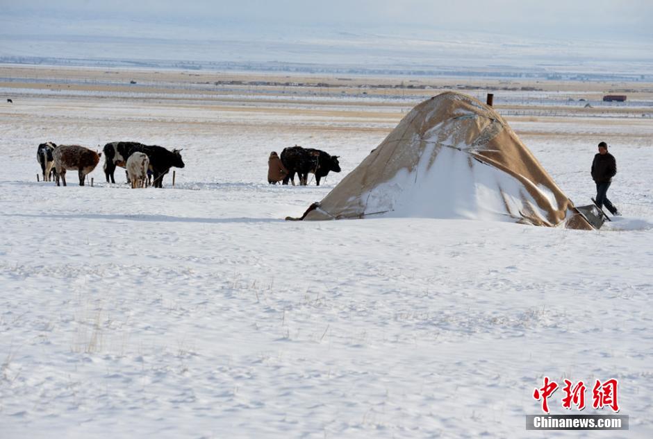 10月10日,新疆哈密地區巴里坤哈薩克自治縣經歷降雪降溫天氣,冰雪覆蓋了道路和原野給當地交通出行和牧民野外放牧造成困難。張建剛 攝