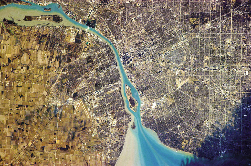 央廣網河南分網消息 據環球網報道:近日,加拿大宇航員克里斯·哈德菲爾德出版了新書《你在這里:環繞地球92分鐘》,書里收錄了150張克里斯從太空拍攝的地球照片。自從2012年 12月21日第三次進入太空以來,他一直在推特上發布在國際空間站拍攝的照片,從環球視角全景展現了地球令人驚嘆的美,引來近30 萬粉絲圍觀。圖為美國密歇根州底特律(右)和加拿大安大略省溫莎(左),兩個國家只隔著一條河。