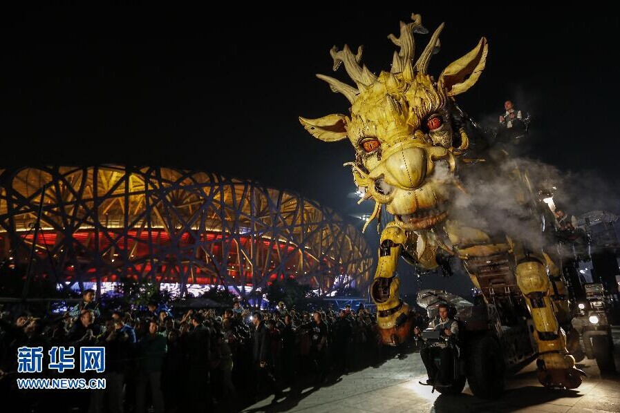 央廣網(wǎng)河南分網(wǎng)消息 據(jù)新華網(wǎng)報(bào)道:自當(dāng)日起至10月19日,紀(jì)念中法建交50周年法國機(jī)械“龍馬”巡游表演在北京奧林匹克公園中心區(qū)舉行。身高12米、重達(dá)47噸的龍頭馬身神獸將與一只高5.7米、體寬6米、重37噸的機(jī)械蜘蛛“大戰(zhàn)”于鳥巢前。為操作這兩個(gè)龐然大物,每頭巨獸都配備有15個(gè)操縱師,而整個(gè)演出團(tuán)隊(duì)多達(dá)180多人。新華社記者 張玉薇 攝