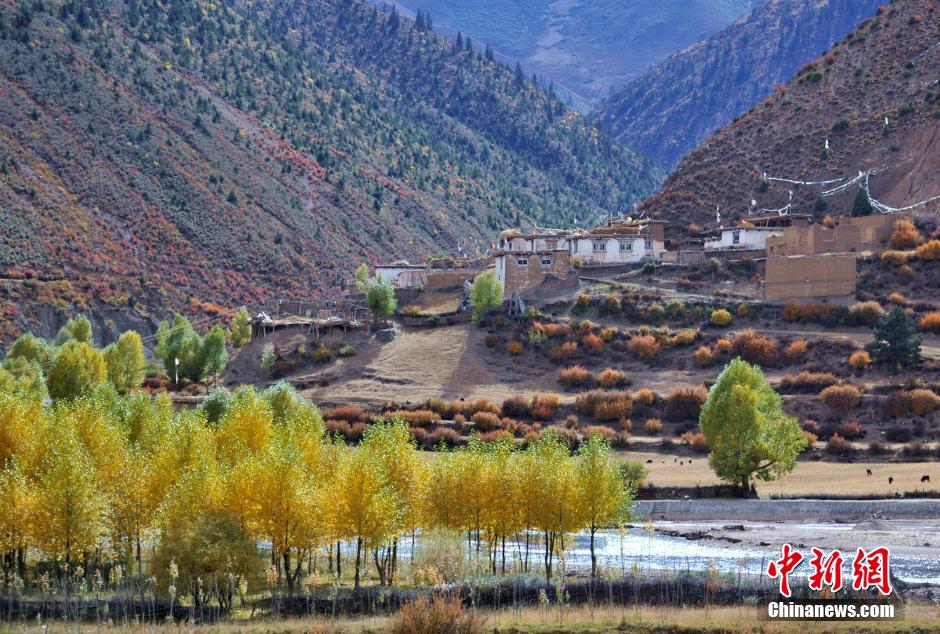 10月中旬以來,國道318川藏線西藏昌都地區境內,迎來一年中最美的季節,藏房、河流、雪山、金色的樹林構成一幅幅美麗的畫卷,讓人流連忘返。圖為西藏昌都國道318川藏線路邊的秋色。中新社發 劉忠俊 攝