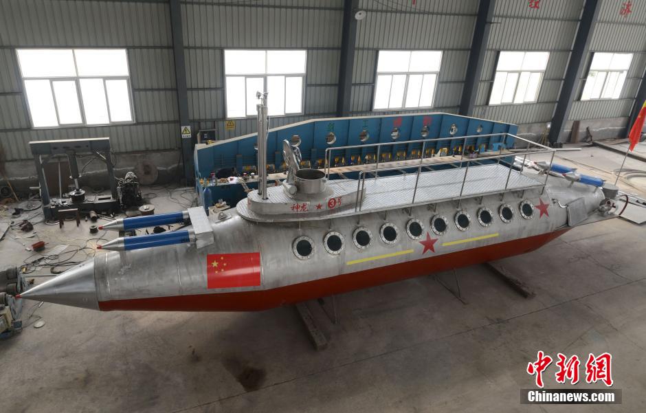 央廣網河南分網消息 據中國新聞網報道:兩年來,張俊林作為“神龍三號”潛艇的總設計、總工程師,帶領他的團隊,攻克一個個技術難關,將全新的“神龍三號”潛艇呈現在人們面前。“神龍三號”長15米,寬2.1米,高3米,自重約25噸左右,能容納20人,艇體采用不銹鋼打造。 “‘神龍三號’行駛速度15海里/小時,下潛深度50米,潛航時間為24小時,續航里程50海里。由3個機漿一體化推動系統,裝備有電動舵,轉彎比較靈活。”圖為2014年12月20日,在安徽阜陽市一集團的金工車間,“神龍三號”潛艇。中新社發 盧啟建 攝 圖片來源:CNSPHOTO