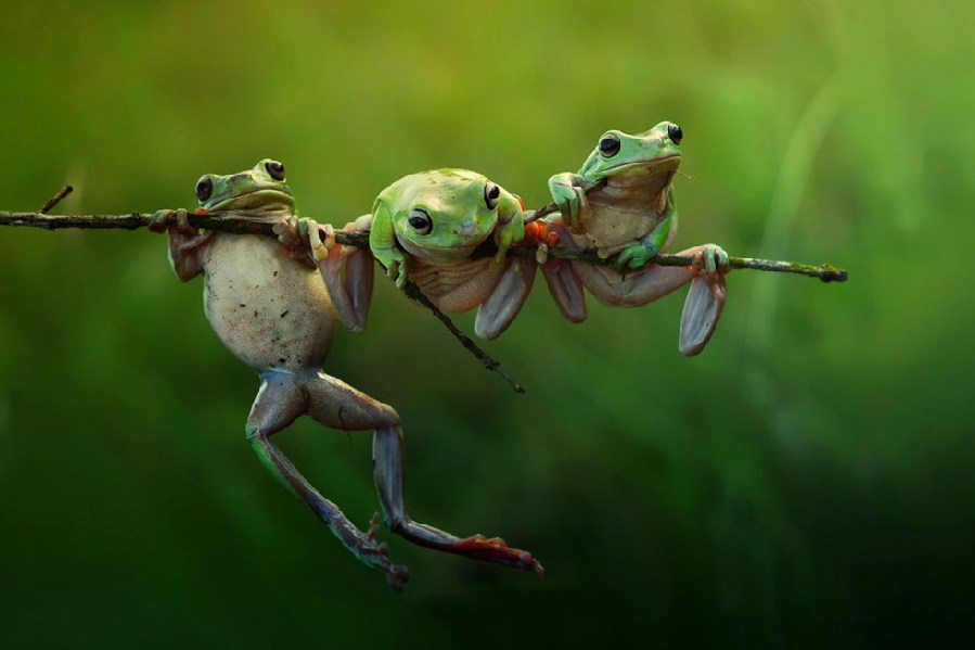 三只青蛙吊在一根纖細的樹枝上維持平衡。(網(wǎng)頁截圖)