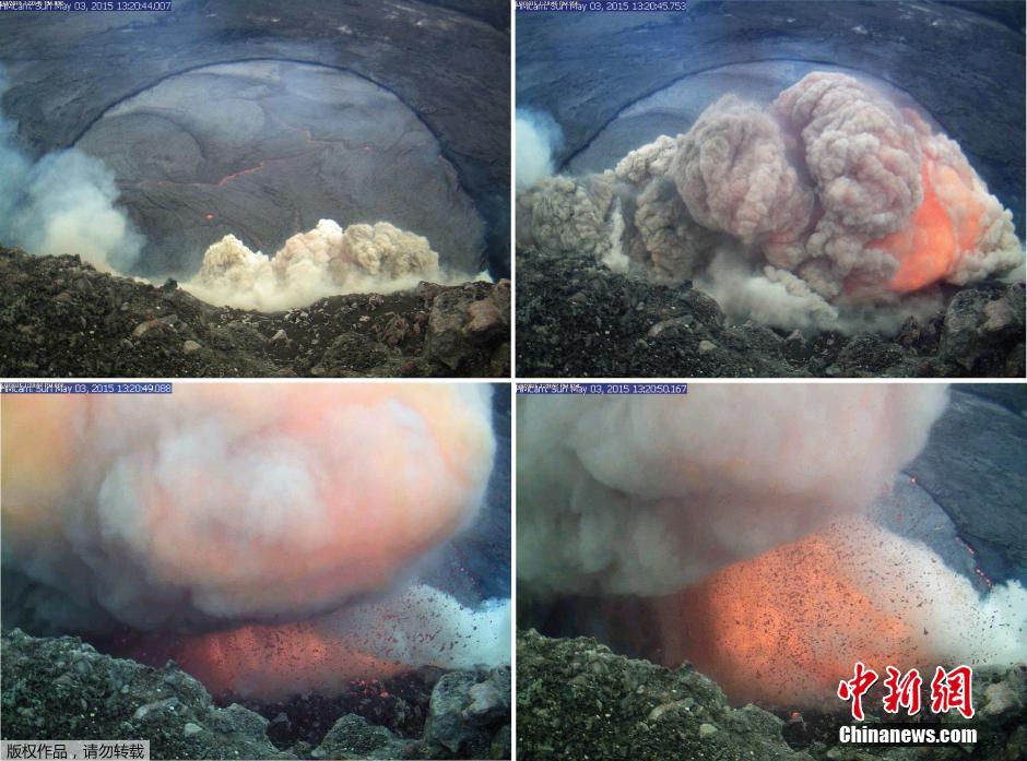 2015年5月5日,美國地質(zhì)調(diào)查局發(fā)布照片顯示,夏威夷基拉韋厄火山的哈里摩摩火山口5月3日崩塌,激起火山灰和熔巖爆炸,狀如烈焰。熔巖湖中的巖漿多次溢出,場面壯觀。