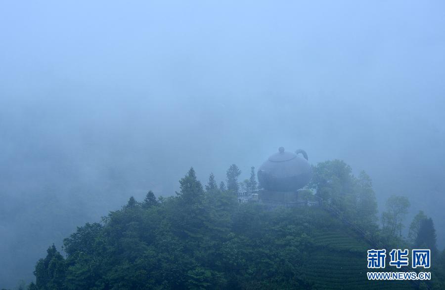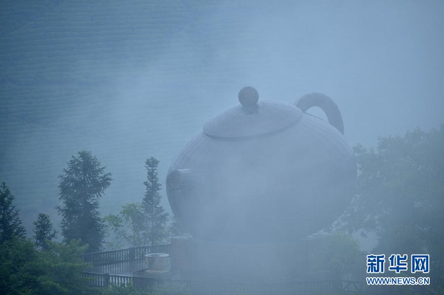 央廣網河南分網消息 春夏之交,湖北名茶“伍家臺貢茶”發源地——恩施土家族苗族自治州宣恩縣伍家臺村時常云霧繚繞,茶山上一把直徑16.5米、高10米的巨型茶壺因此“熱氣騰騰”,為茶園增添了別樣的風情。新華社發(宋文 攝)