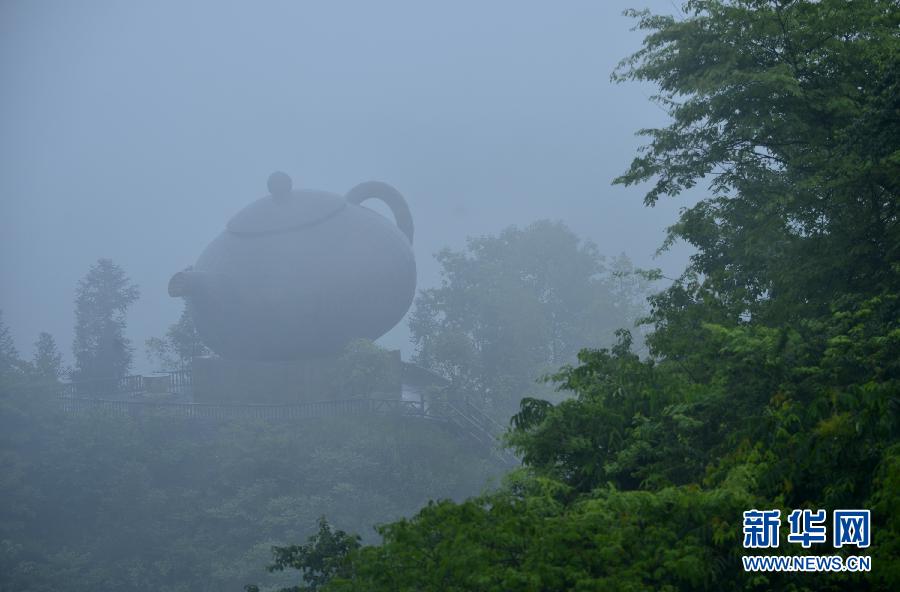 這是5月5日在湖北省宣恩縣伍家臺村拍攝的巨型茶壺。春夏之交,湖北名茶“伍家臺貢茶”發源地——恩施土家族苗族自治州宣恩縣伍家臺村時常云霧繚繞,茶山上一把直徑16.5米、高10米的巨型茶壺因此“熱氣騰騰”,為茶園增添了別樣的風情。新華社發(宋文 攝)