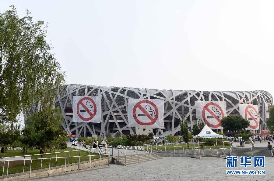 5月30日,北京國家體育場“鳥巢”懸掛巨幅禁煙標志。