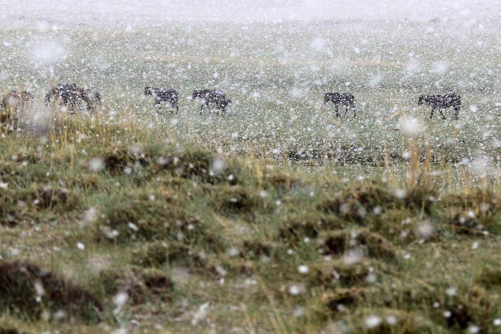 2015年5月31日,受冷空氣影響,新疆哈密北部草原上出現了風雪降溫天氣,夏日的草原大雪紛飛,給夏日的草原披上銀裝。