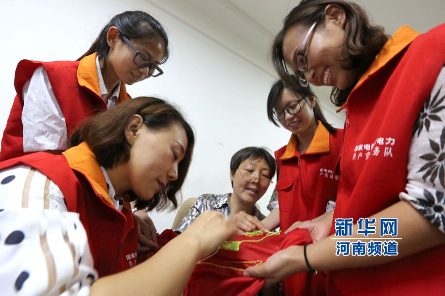 6月29日,河南省安陽縣供電公司黨員活動室,有著32年黨齡的老黨員楊金花(中)正在和黨員服務隊的青年志愿者一起繡黨旗,向黨的94華誕獻禮。