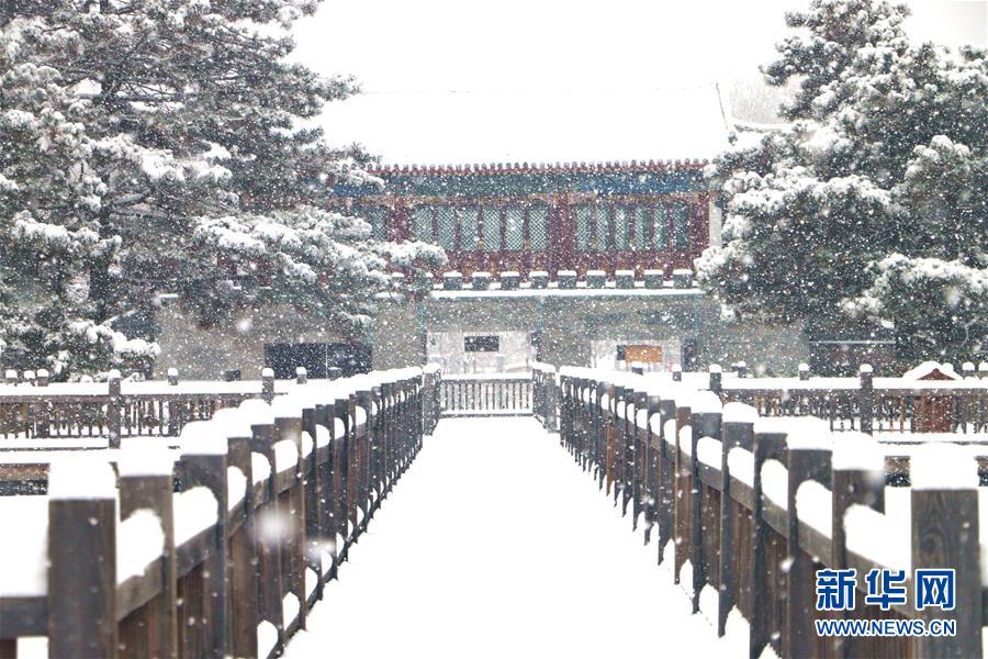 央廣網河南分網消息 當日,河北北部地區迎來大范圍降雪,承德市著名皇家園林、世界文化遺產避暑山莊被白雪覆蓋。 新華社發(劉環宇 攝)