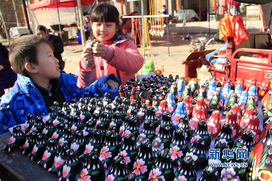 2月14日,游客在河南省浚縣大伾山古廟會上選購“泥咕咕”。