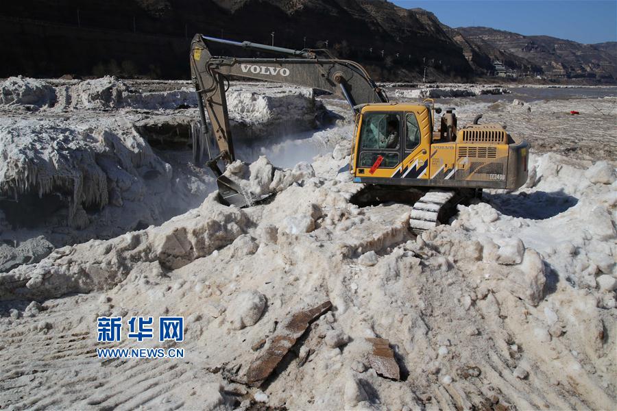 2月16日,山西吉縣黃河壺口瀑布景區工作人員用挖掘機鏟除堆冰。