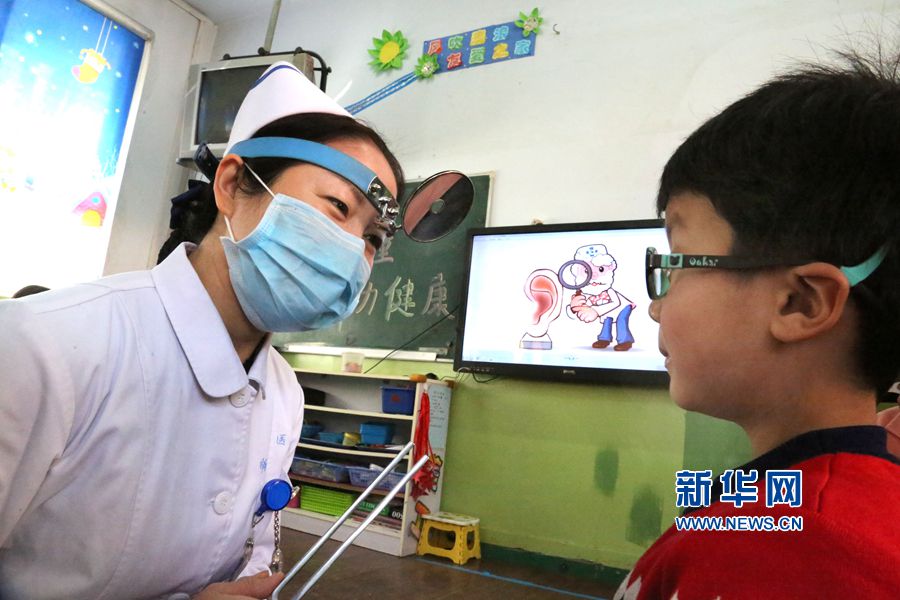 2016年3月2日,河南省安陽市婦女兒童活動中心幼兒園,來自安陽地區醫院耳鼻喉科的醫生曹艷利正在和大三班的任博森小朋友親切交流并用音叉(聽力檢測儀)為其做聽力檢查。