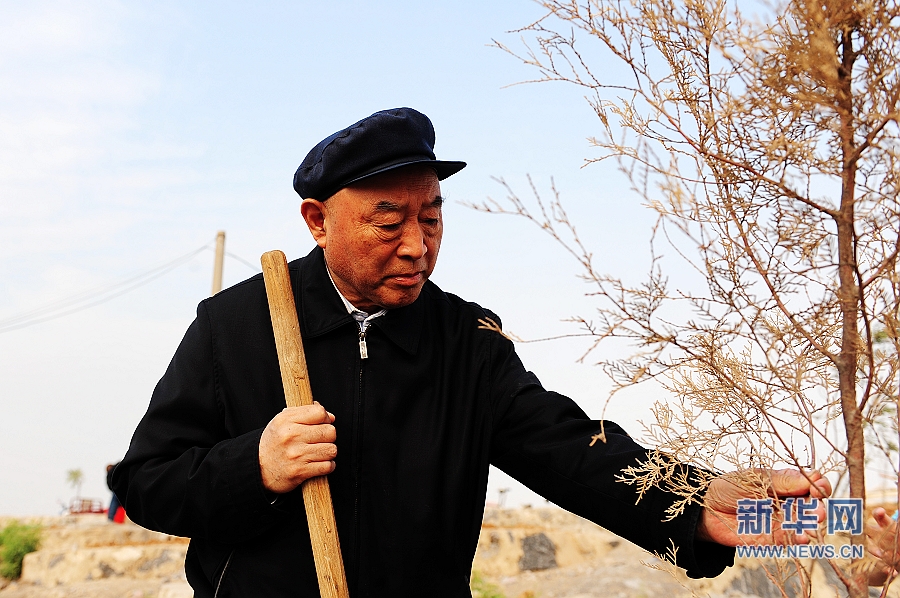 在河南衛(wèi)輝市唐莊鎮(zhèn),吳金印在查看一棵新種下的柏樹(shù)的生長(zhǎng)情況(5月25日攝)。
