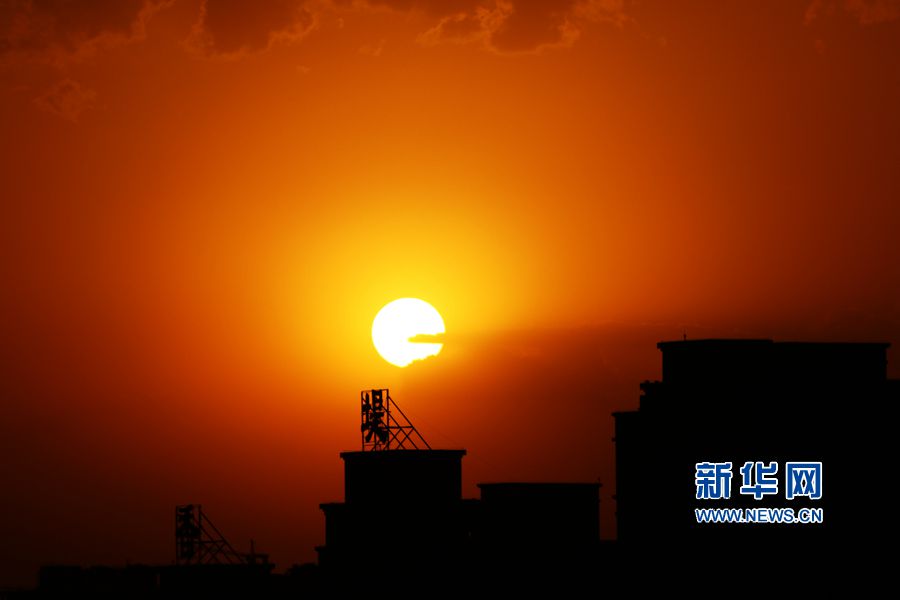 6月14日傍晚,河南省鄭州市,紅日映紅天際,城市建筑在落日映照下美麗如畫。(杜春祥 攝)