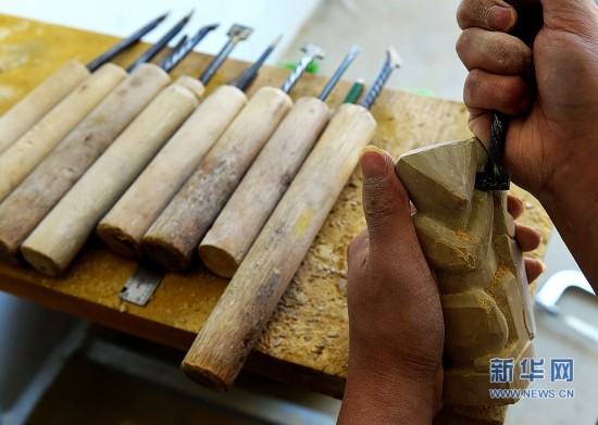 6月16日,王國(guó)慶在工作室內(nèi)雕刻石猴。