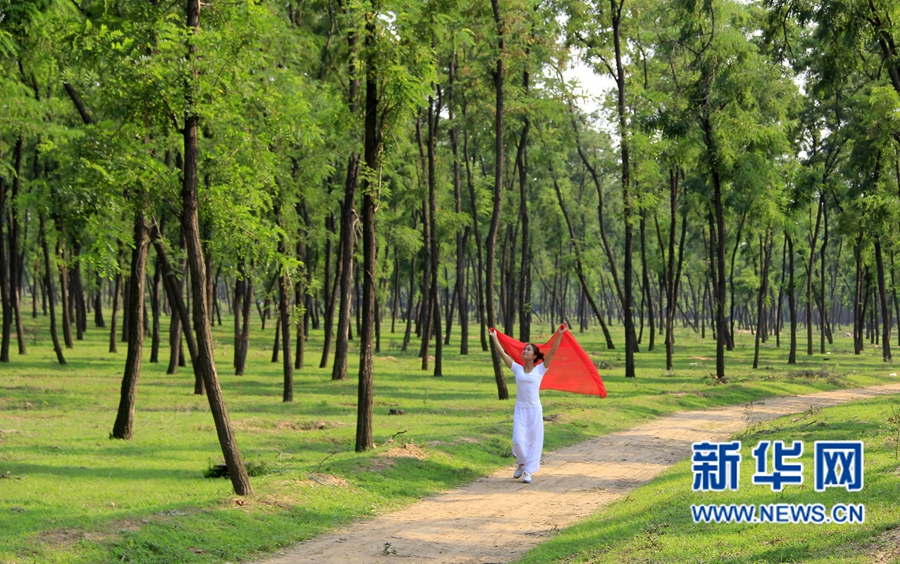 6月19日,瑜伽愛好者在內(nèi)黃縣萬畝槐林內(nèi)練習(xí)瑜伽。